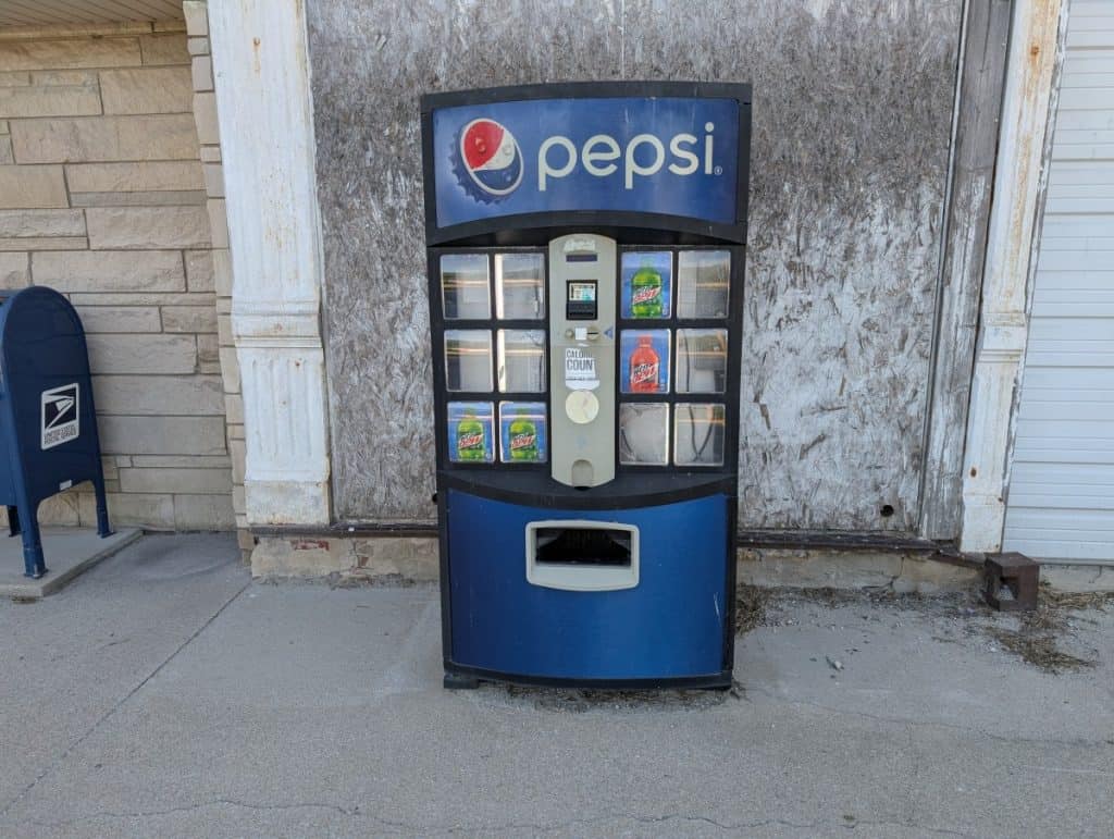 In the heart of Woodland, Illinois – just off our bustling Main Street – sits the crown jewel of local commerce: The Woodland Pop Machine. Conveniently wedged between the Woodland Post Office and a another building, this lone vending machine stands as a beacon of cold, carbonated possibility.
